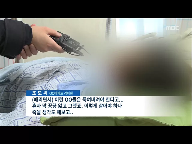 (앵커)여러분 안녕하십니까/ 광주의 한 아파트 주민이 경비원을 두들겨 팼다가 경찰에 입건됐습니다.// 이래도 되나 싶은데 사과는 경비원이 먼저 했다고 합니다. 갑질하는 입주민 앞에서 경비원은 을이 될 수 밖에 없으니까요. 김인정 기자가 취재했습니다./ (기자) 지난 4일, 저녁 8시 30분쯤. 아파트 경비원 65살 조 모 ...