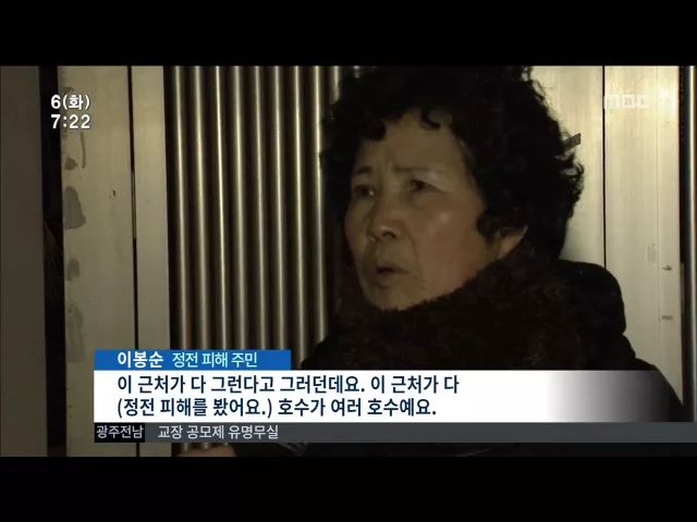 (앵커) 어젯밤(5) 광주 광산구 일부 지역에서 정전이 발생해 주민들이 2시간 동안 추위 속에 큰 불편을 겪었습니다. 주민들은 집안에서도 두꺼운 외투를 꺼내 입어야 했고, 샤워도 제대로 할 수 없었습니다. 송정근 기자입니다. (기자) 주택가 골목이 암흑에 둘러 싸였습니다. 집 안에는 촛불이 켜져 있고, 김치냉장고는 전...