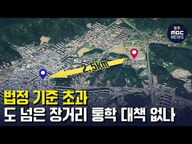 (앵커) 신축아파트 입주가 많은 전남지역 도심에서는 초등학생들의 장거리 통학을 둘러싼 논란이 끊이질 않고 있습니다. 심지어 내년 입주 예정인 한 대단지 아파트는 초등학교와 2.5km 떨어져 있는데 걸어서 30분 이내여야 하는 법정 통학 기준을 초과한 것으로 나타나 새로운 교육현안으로 떠오르고 있습니다. 강서영 기...
