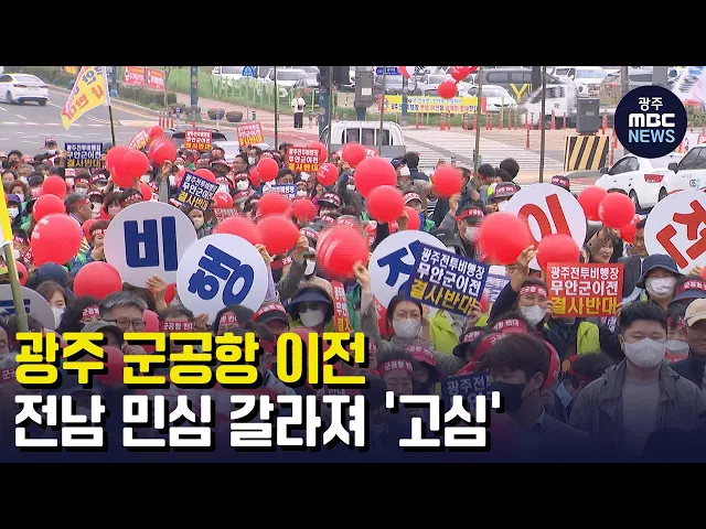 (앵커) 광주전남 최대 현안으로 떠오른 광주군공항특별법의 국회 통과가 초읽기에 들어갔습니다. 하지만 군공항 이전 지역으로 거론된 곳에서는 주민들간 찬반 대립이 격화되면서 전라남도의 고민이 커지고 있습니다. 김양훈 기자가 보도합니다. (기자)광주전투비행장 이전 결사반대 머리띠를 두룬 무안군민들이 전남도청 ...