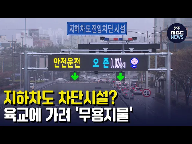 (앵커) 3년 전 부산 초량 지하차도 침수사고로 3명이 숨졌는데 이를 계기로 전국 지하차도마다 진입 차단 시설이 만들어지고 있습니다. 그런데 육교와 바짝 붙어 설치하는 바람에 시야가 가려 있으나마나한 차단시설이 돼버린 곳이 있습니다. 이걸 설치하는 데 얼마의 세금이 들어갔는지 보시죠. 강서영 기자가 취재했습니...