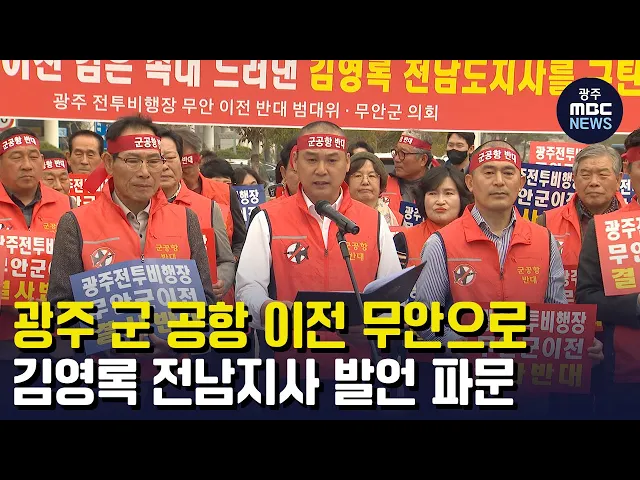 (앵커) 광주 군공항 이전 문제가 새로운 국면에 접어들었습니다. 그동안 별다른 입장을 내지 않았던 김영록 전남지사가 광주 군공항을 무안으로 이전해야 한다고 입장을 밝히면서 지역사회에 파문이 일고 있습니다. 먼저, 문연철 기자가 보도합니다. (기자) 무안군의원들이 전남도청 앞에서 김영록 지사의 발언을 규탄하며 ...