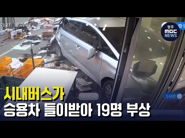 (앵커) 광주 말바우시장 사거리에서 시내버스가 승용차를 들이받았는데 이 승용차가 상가로 돌진해 승객 등 시민들이 다쳤습니다. 버스기사가 안전거리를 지키지 않아 사고를 낸 것으로 보고 있습니다. 김초롱 기자의 보돕니다. (기자) 주황색 신호에 급하게 멈춘 승용차 뒤로 버스 한 대가 달려오더니, 뒤에서 그대로 들이...