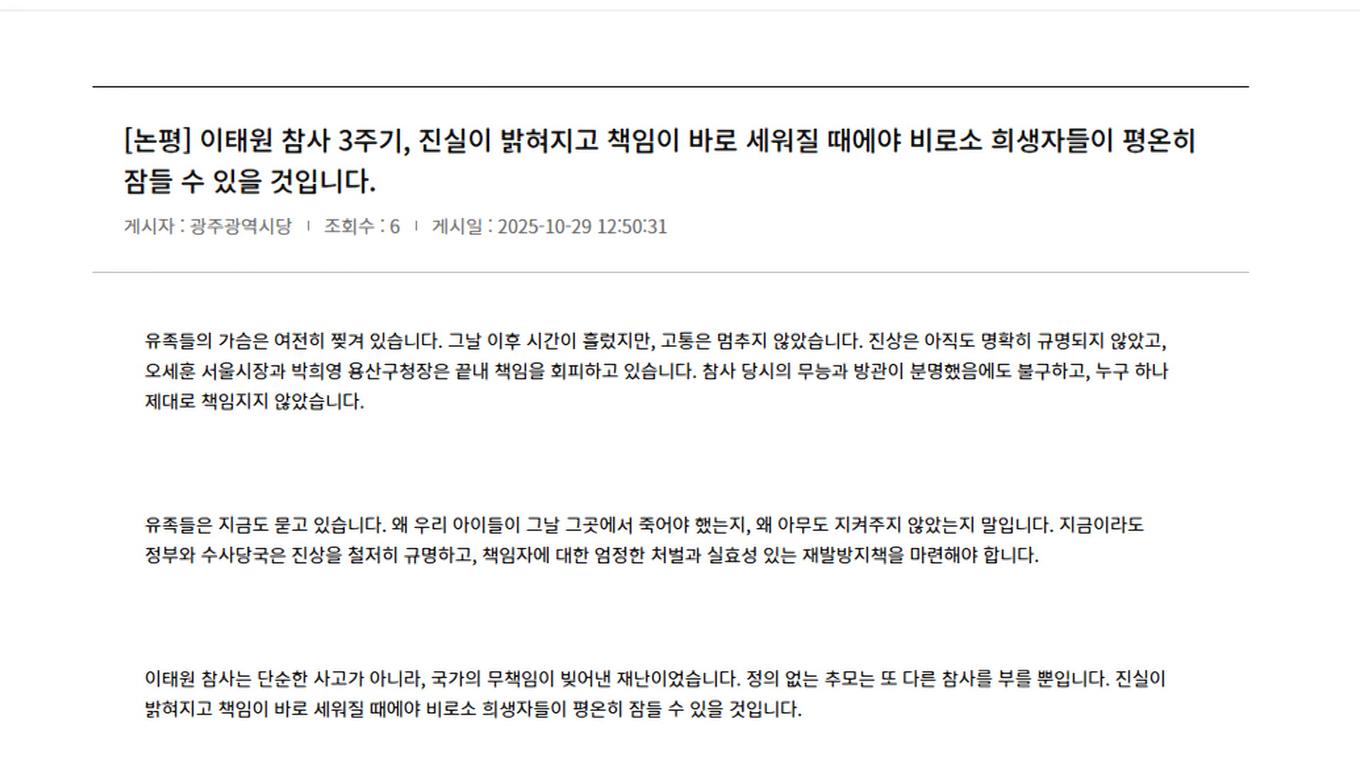 더불어민주당 광주시당은이태원 참사 3주기를 맞아진실이 밝혀지고 책임이 바로 세워질 때에야비로소 희생자들이 평온히 잠들 수 있을 것이라고 밝혔습니다.민주당 광주시당은 논평을 통해그날 이후 시간이 흘렀지만고통은 멈추지 않고 유족들의 가슴은 여전히 찢겨 있다며정부와 수사당국은 진상을철저히 규명해야 한다고 ...