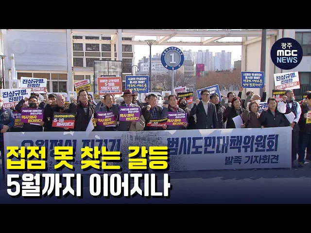 (앵커) 5월단체들이 특전사동지회와 강행한 행사와 관련해 지역 사회 갈등이 좀처럼 풀리지 않고 있습니다. 오늘은 양측이 각각 기자회견을 열어 상대를 비판했습니다. 시민사회단체들은 5월단체들이 사과해야 한다며 집행부가 책임을 지고 물러날 것을 요구했고 5월단체들은 진상규명을 위한 행동을 오해하고 있다며 물러...