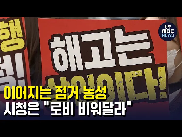 (앵커) 광주시청 1층에서 보육 대체 교사들이 점거 농성을 시작한지 곧 한 달이 됩니다. 광주시는 시청 로비를 비워달라고 하고, 노동자들은 물러설 수 없다고 주장하며 양측의 갈등이 깊어지고 있습니다. 보도에 이다현 기자입니다. (기자) 보육 대체 교사들의 농성은 강기정 광주시장 자택 앞에서도 이어졌습니다. "강기...