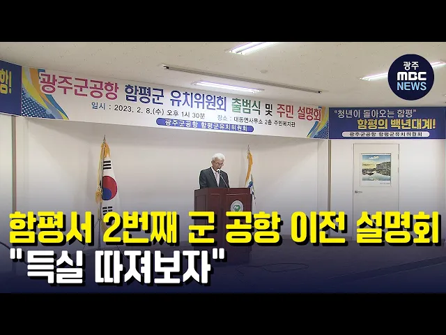 (앵커)함평에서 광주군공항 이전을 위한 두번째 주민 설명회가 열렸습니다. 유치 찬반 의견이 대립했던 지난번과 달리 지역의 군공항 이전 득실을 점검하는데 주력하자는 목소리가 주를 이뤘습니다. 주현정 기자입니다. (기자) 함평에서 두번째로 열린 광주 군 공항 이전을 위한 주민설명회. 빈 자리를 찾을 수 없을만큼 주...