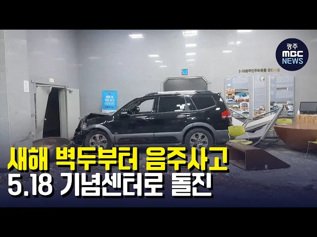 (앵커)새해부터 만취 상태에서 사고를 낸 운전자들이 경찰에 붙잡혔습니다.한 SUV 차량 운전자는 5.18 기념센터로 돌진했는데 새벽 시간대여서 다행히 인명 피해는 없었습니다.우종훈 기자가 취재했습니다. (기자)검은색 SUV의 앞쪽 엔진룸이 완전히 파손됐습니다.칸막이며 책상, 의자가 나뒹굴고,차량이 돌진한 방향대로 ...