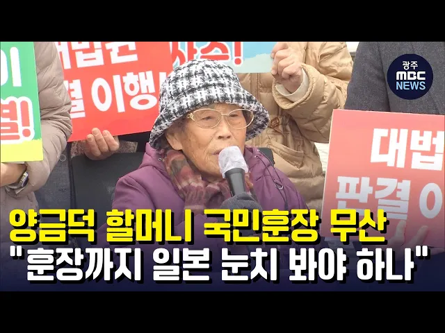 (앵커) 일제 강제동원 피해자 양금덕 할머니의 국민훈장 모란장 서훈이 보류됐습니다. 외교부가 훈장 서훈에 제동을 걸었기 때문인데요. 피해자 단체는 대법원 판결을 사실상 지연한 것도 모자라 서훈까지 무산시키냐며 반발하고 있습니다. 우종훈 기자의 보도입니다. (기자)일제 강제동원 피해자 양금덕 할머니의 별칭은 '...