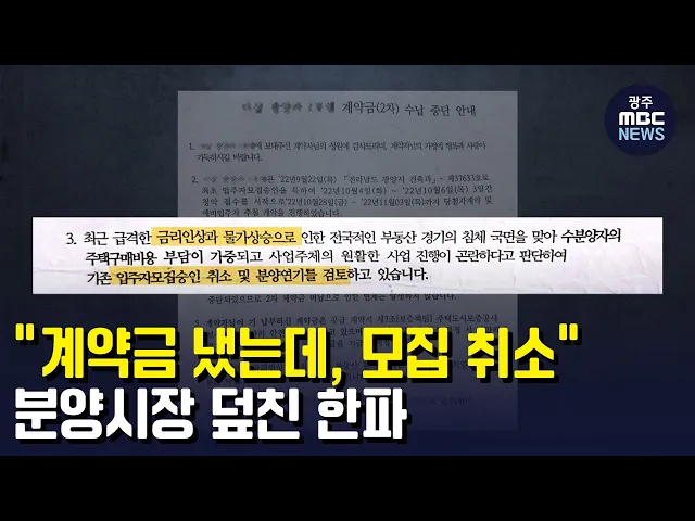 (앵커)부동산 시장이 위축되면서, 새 아파트 분양 시장에도 한파가 덮쳤습니다. 광양의 한 단지는 시행사가 1차 계약금까지 받았지만, 고금리와 물가 상승을 이유로 이례적인 분양 연기까지 검토하고 있습니다. 유민호 기자가 취재했습니다. (기자) 터파기 토목공사가 진행 중인 광양 마동의 아파트 공사 현장입니다. 총 92...