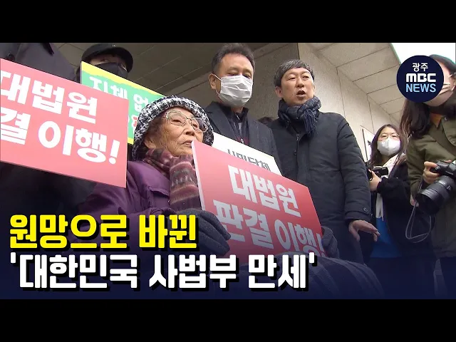 (앵커)4년 전 대법원은 일제 전범기업이 강제동원 피해자들에게 배상해야 한다고 판결했습니다. 판결에 불복하는 미쓰비시 중공업, 합리성을 찾는 정부, 주심 퇴임 이후 소식 없는 사법부까지. 지난 2018년 대한민국과 사법부 만세를 외쳤던 할머니가 다시 거리에 섰습니다. 우종훈 기자의 보도입니다. (기자) 미쓰비시 중...