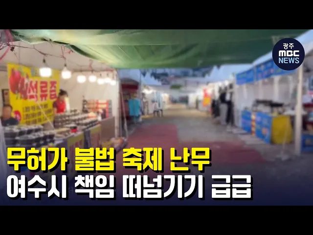 (앵커) 광주전남지역 곳곳에서 가을 축제가 펼쳐지고 있는데요. 여수에서는 무허가 불법 축제가 논란이 되고 있습니다. 여수시는 몰랐다며 책임을 떠넘기고 있습니다. 보도에 김단비 기자입니다. (기자)전어구이부터 바비큐까지 온갖 음식들이 한데 모였습니다. 한쪽에선 놀이기구 운영이 한창입니다. 지난 9월 8일부터 닷...