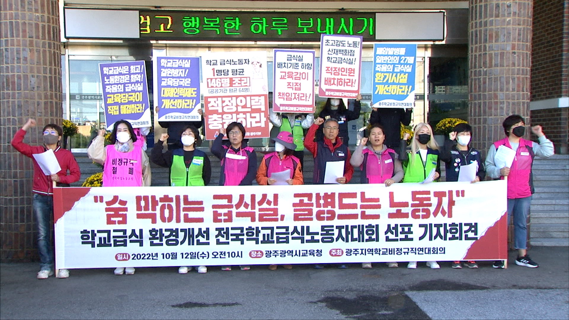 광주 학교 비정규직 노조가 건강을 위협받는 급식실 노동자들의 근무 환경 개선을 촉구했습니다. 광주 학교비정규직연대는 광주시교육청에서 근무 중 발생한 폐암으로 산재 인정을 받은 노동자가 참석한 가운데 기자회견을 열고 급식실 노동자의 폐암 발병률이 일반인보다 35배 높다며 근무 환경 개선을 요구했습니다. 이번...