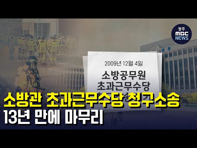 (앵커) 지난 13년동안 이어졌던 소방공무원 미지급 초과근무수당 관련 소송이 마무리 됐습니다. 전라남도와 소방관들이 법원의 화해 결정 권고를 따르기로하면서 진행중이던 모든 소송도 중단하기로 했습니다. 양정은기자입니다. (기자)화재 현장, 재난 현장 등 각종 위험 상황 최일선에 나서고 있는 소방공무원들 열악한 ...