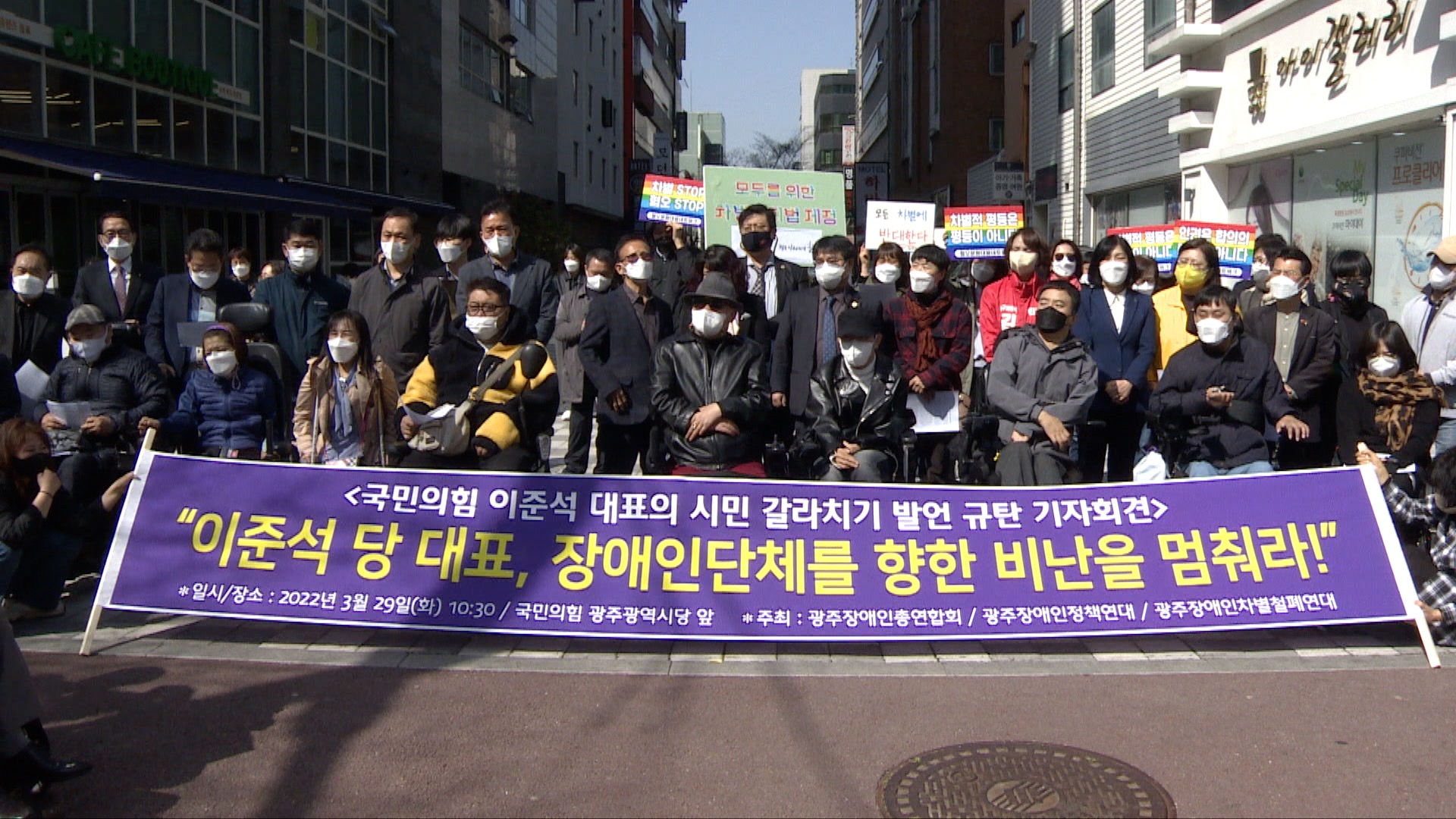 국민의힘 이준석 대표가 출근길 지하철 시위를 벌이는 전국장애인차별철폐연대를 향해 비판 수위를 높이는 가운데 광주 지역 장애인단체들이 이 대표를 규탄하고 나섰습니다. 광주장애인정책연대 등은 국민의힘 광주시당 앞에서 기자회견을 열고, 전체 지하철역에 엘리베이터를 설치하라는 것은 장애인 이동권 보장을 위한 ...