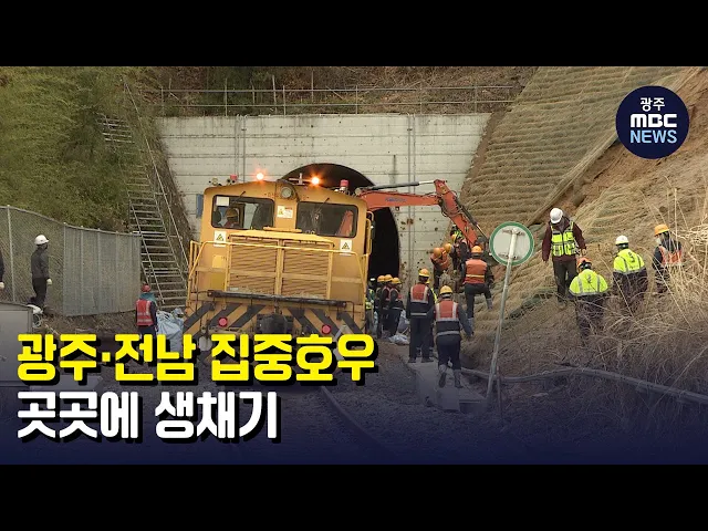 (앵커) 광주·전남을 비롯한 남부에서도 밤 사이 100밀리미터 안팎의 집중호우가 쏟아졌습니다. 경전선 일부 철로 구간에 토사가 무너져 내려 열차편 일부의 운행이 중단 되는 등 피해가 잇따랐습니다. 송정근 기자입니다. (기자) 기차가 다니는 터널 앞. 정비 열차 위에 실린 굴착기가 철로로 흘러내린 흙을 치웁니다. 토사...