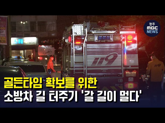 (앵커) 불이 났을 경우 골든타임 확보를 위해 소방차가 한시라도 빨리 현장에 도착하는 게 중요합니다. 법령 개정으로 운전자가 소방차에 양보를 하지 않으면 과태료도 물어야 하는데요. 소방차 길터주기가 잘 지켜지고 있을까요? 양정은기자가 취재했습니다. (기자)지난달 23일 목포 상동의 한 편도 2차선 도로. 다급한 소...