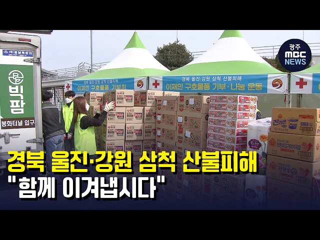 (앵커) 지난 금요일부터 이어진 대형 산불로 경북과 강원지역에 큰 피해가 발생했는데요. 하루아침에 갈곳을 잃은 주민들도 적지 않습니다. 이렇게 산불 피해를 입은 이재민들을 돕기 위해 지역에서도 십시일반 힘을 보태고 있습니다. 문형철 기자입니다. (기자)이른 아침부터 체육관 앞에 화물차들이 연이어 들어섭니다. ...