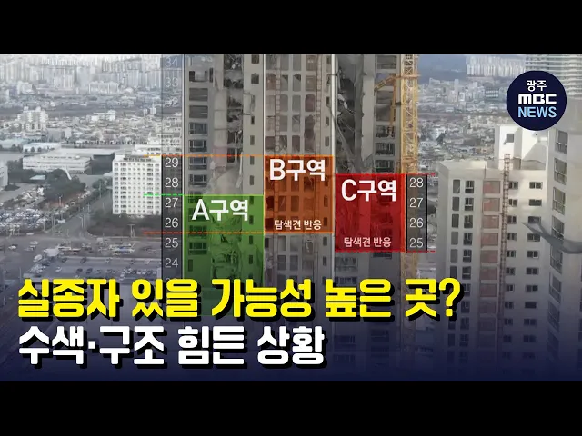 (앵커)광주 아이파크 붕괴 사고 현장에서실종자 두 명이 추가로 발견됐지만아직 구조되지 않고 있습니다.발견 장소의 천장 슬라브에 균열이 있고건물 외벽도 불안한 상태로 서 있어작업에 속도를 내기 힘든 상황입니다.나머지 세 명의 실종자가 있을 가능성이 높은 곳이 어딘지,임지은 기자가 취재했습니다.(기자)열 여섯개...