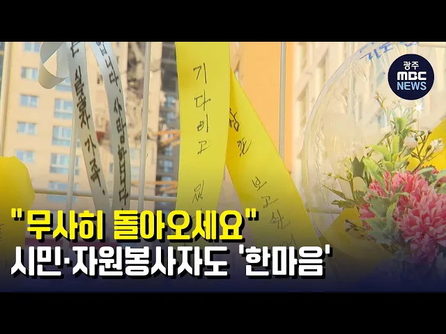 (앵커) 광주 화정동 아이파크 아파트 붕괴사고 발생한지 보름이 다 되가고 있죠. 실종자 수색이 장기화 되고 있지만 시민과 자원봉사자들이 한마음으로 실종자 가족과 구조대원들에게 힘을 보태고 있습니다. 보도에 김영창 기잡니다. (기자) 참담한 붕괴 사고 현장 한켠에 내걸린 노란리본. "무사히 돌아오길 바랍니다", "...