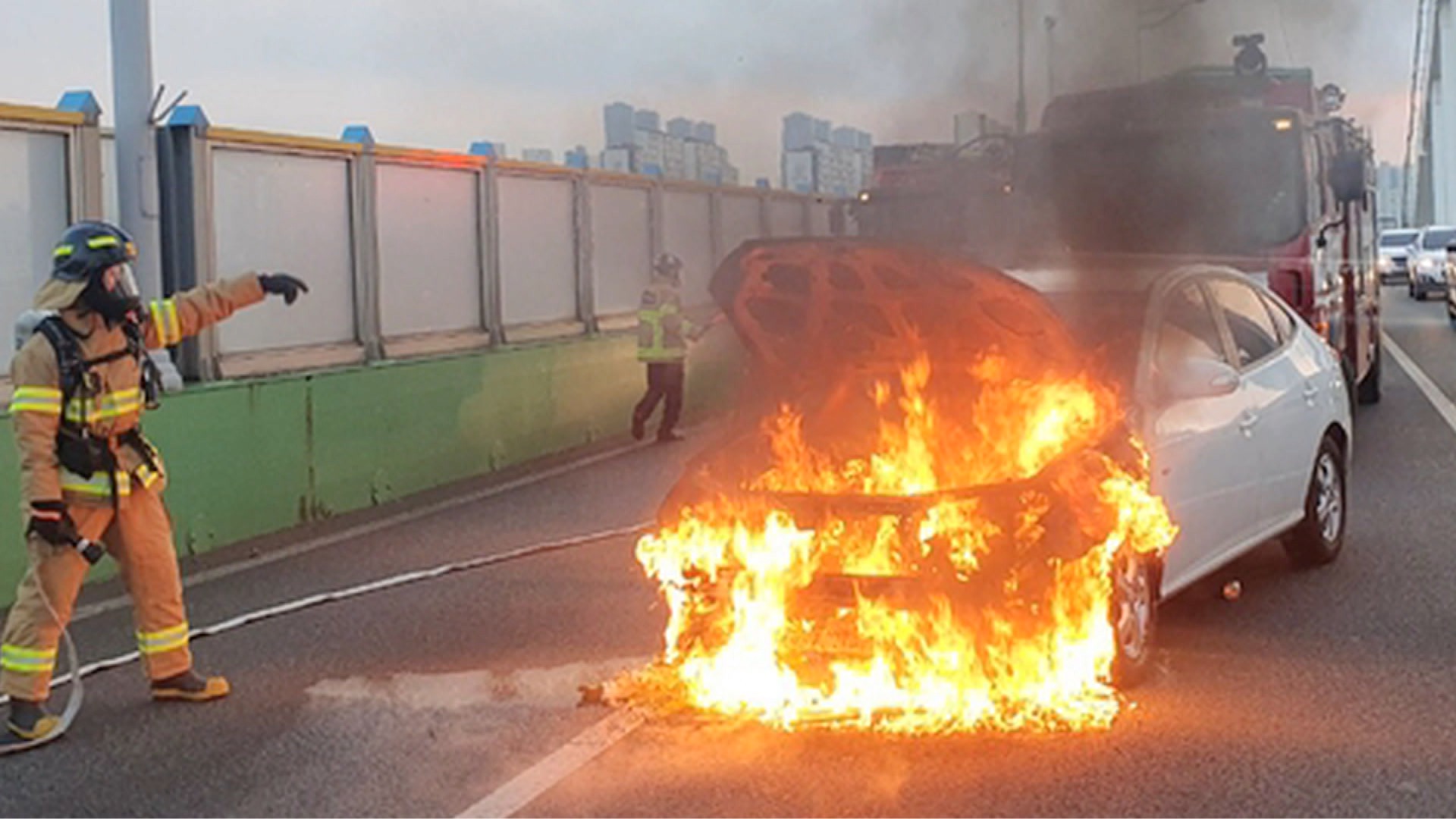 출근길 주행중이던 승용차서 불..30여 분 정체