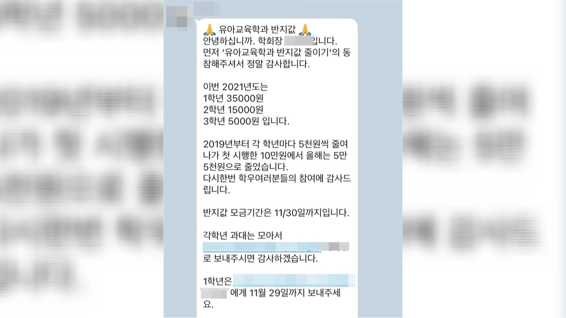 선배들에게 졸업 선물을 준다는 명목으로 강제 모금을 하는 구습이 여전하다는 지적이 나왔습니다.학벌없는사회를위한시민모임은 보도자료를 내고, 광주의 한 대학교 유아교육과 학생회가선배들에게 졸업 선물을 줄 목적으로 후배들에게 돈을 걷는 등선후배 위계 문화로 인한 부조리가 일부 대학에 남아 있다고 비판했습니...