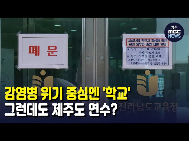 (앵커)11월부터 단계적 일상회복이 시작됐지만 코로나19가 확산되고 있는 학교는 말 그대로 비상입니다. 전남교육청 건물까지 폐쇄될 정도로 심각한 상황인데 교장과 교육청 고위 간부들은 제주도로 연수를 떠나고 있습니다.양현승 기잡니다.(기자)전남교육청 문이 굳게 잠겨 있습니다. 집단감염이 발생한 목포의 한 중학...