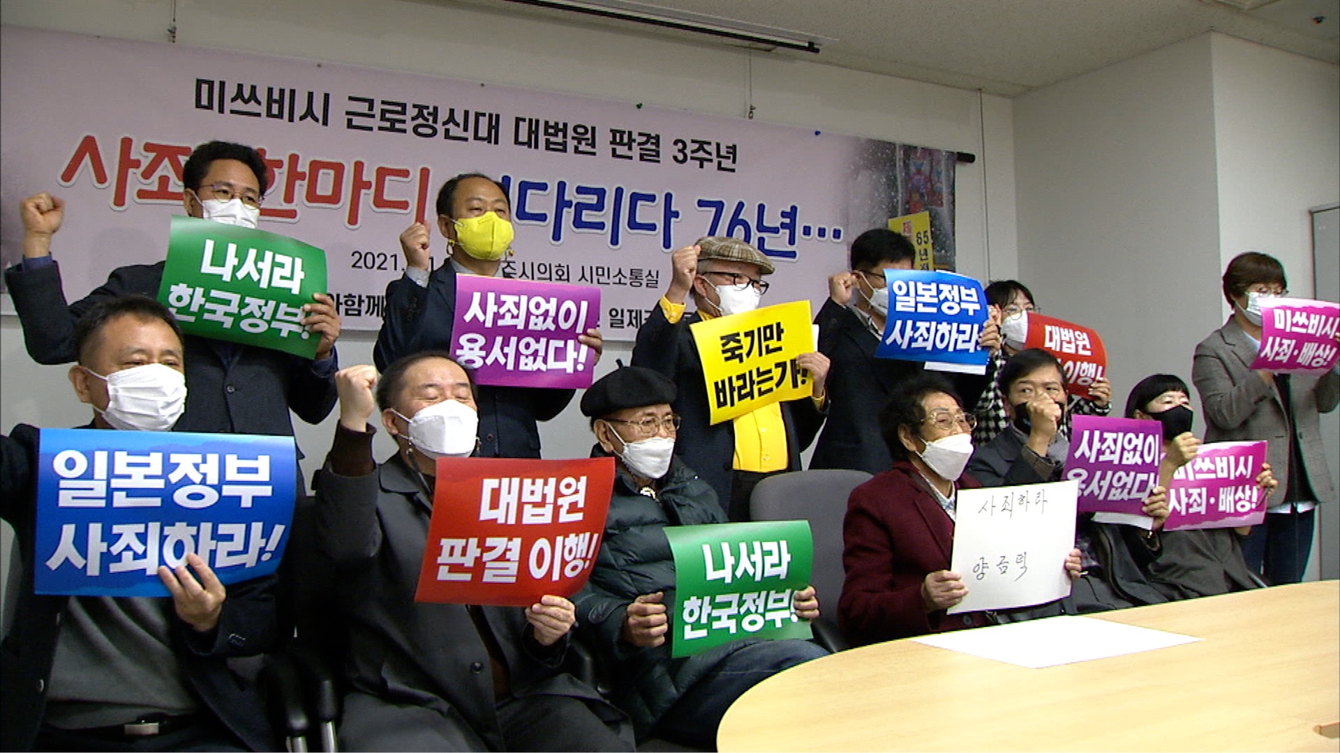(앵커)일제 전범기업 미쓰비시 중공업의 손해배상 책임을 인정한대법원 판결이 난 지 3년이 지났습니다.하지만 일본 정부와 미쓰비시 중공업은 책임 인정은커녕소송을 거듭하며 시간만 끌고 있고그사이 피해자 두 분은 세상을 떠났습니다.정부의 책임 있는 행동이 절실합니다.우종훈 기자가 취재했습니다.(기자)일본 나고야...