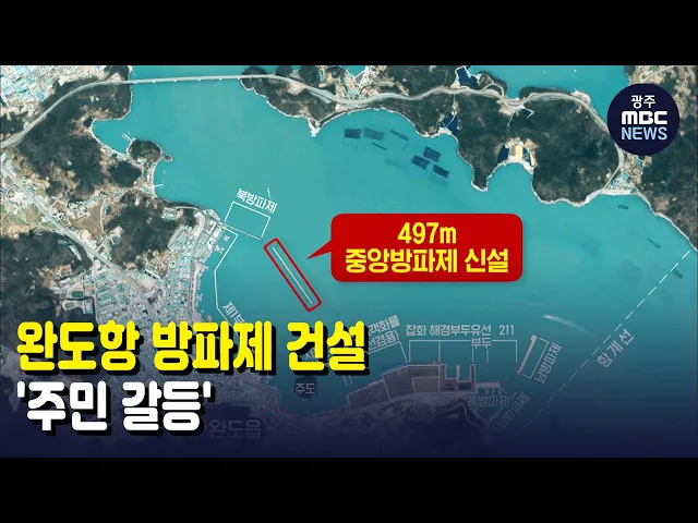 (앵커) 완도항 중앙방파제가 오는 2025년 완공될 예정인데요 방파제 건설 공사를 놓고 주민들의 찬반이 엇갈리고 있습니다. 김 윤 기자가 취재했습니다.(기자) 완도항 앞바다에 건설용 크레인이 정박해 있고오탁방지막이 펼쳐져 있습니다.완도항 북방파제 인근에 길이 497미터짜리 중앙방파제가 공사에 들어간 것은 지난 5...
