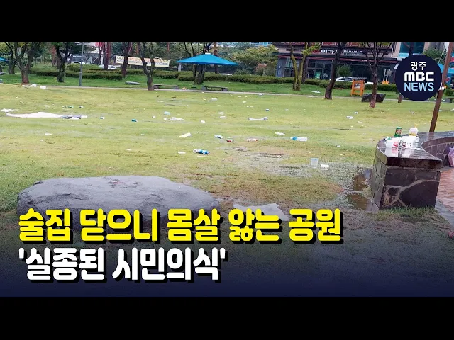 (앵커)밤 10시 이후 영업 금지가 지속되고날씨도 선선해지면서 도심 공원이 밀려드는 음주객들로 몸살을 앓고 있습니다.코로나 감염 우려가 높아지는 것은 물론,쓰레기 무단 투기로환경 오염까지 부추기고 있습니다.강서영 기자입니다.(기자)지난 23일 밤 순천 조례호수공원.연휴가 끝난 평일인데도 돗자리를 펴고 음주를 ...