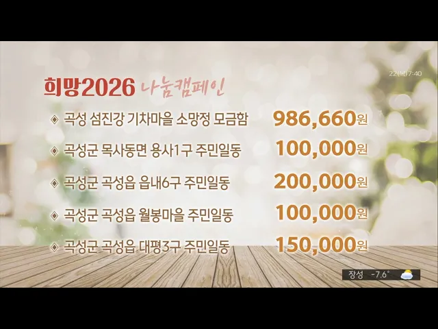 '희망 2026 나눔 캠페인'에 성금을 보내주신 분들입니다.'광주학강초등학교 학생‧학부모‧교직원 일동 1,432,790 담양무정초등학교 학생‧학부모‧교직원 일동 548,000 구례군 간전면 대촌마을회 410,000 구례군 간전면 거석마을 370,000구례군 간전면 서예부 100,000곡성 섬진강 기차마을 소망정 모금함 986,660곡성군 목사동...