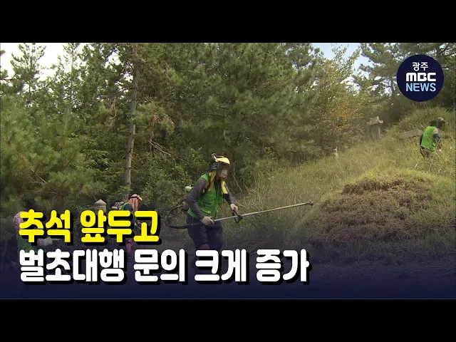 (앵커) 추석을 앞두고 벌초대행 문의가 지난해보다크게 증가하고 있습니다.코로나 확산이 이어지면서군 단위 자치단에서 고향방문 자체를 요청해 벌초대행도 크게 증가한 것으로 분석되고 있습니다.김 윤 기자가 취재했습니다.(기자)해남군의 한 야산에서 봉분 벌초작업이 한창입니다.산림조합 회원들로 구성된 영림단이 일...