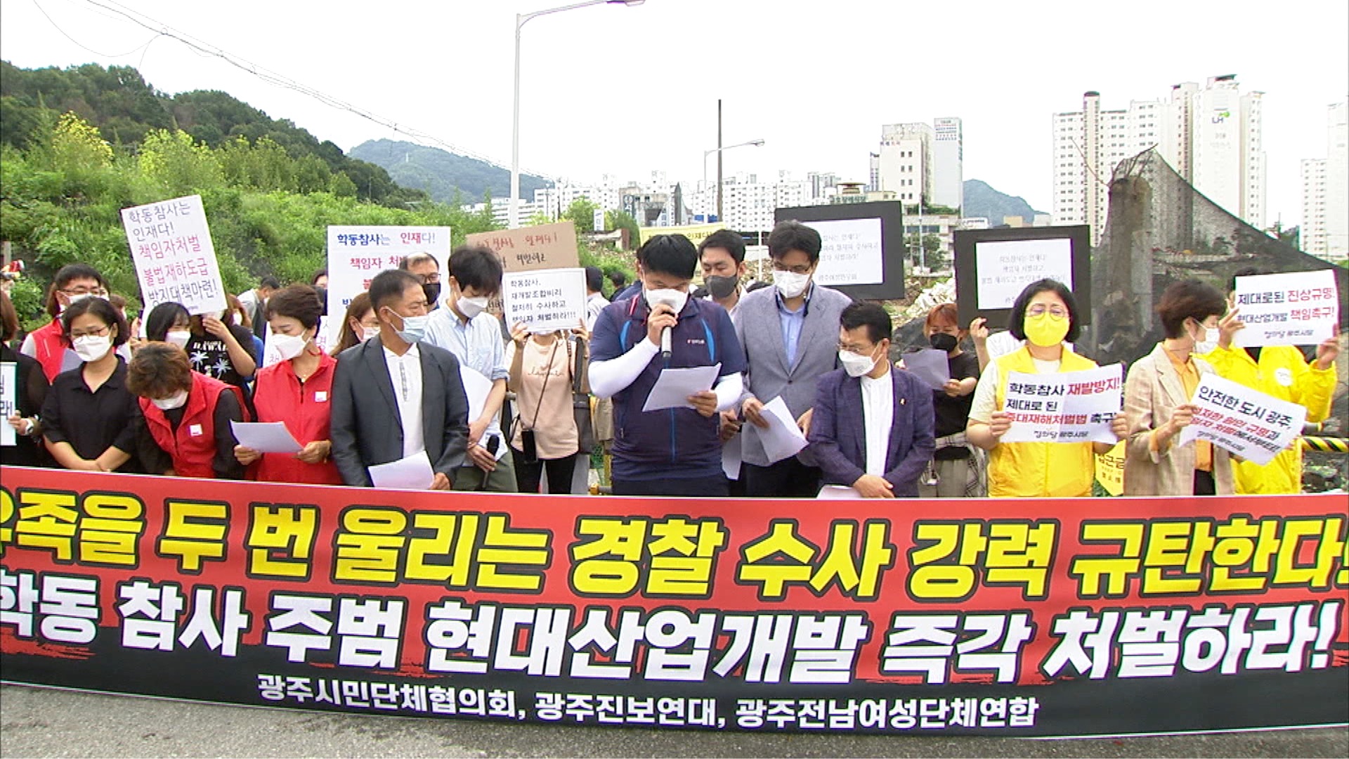광주 학동 붕괴참사 유가족과 시민단체들이철저한 진상규명과 책임자 처벌을 촉구했습니다.유가족과 시민단체로 구성된 시민사회는오늘(27) 오전 광주 학동 붕괴참사 현장에서 기자회견을 열고경찰 수사 등 진상규명을 위한 움직임이 더디다며책임자에 대한 철저한 처벌을 촉구했습니다.또 재발방지 대책 수립 등 없이유가...