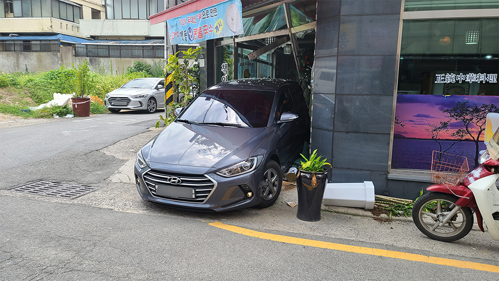 후진하던 승용차 식당으로 돌진 .. 2명 부상