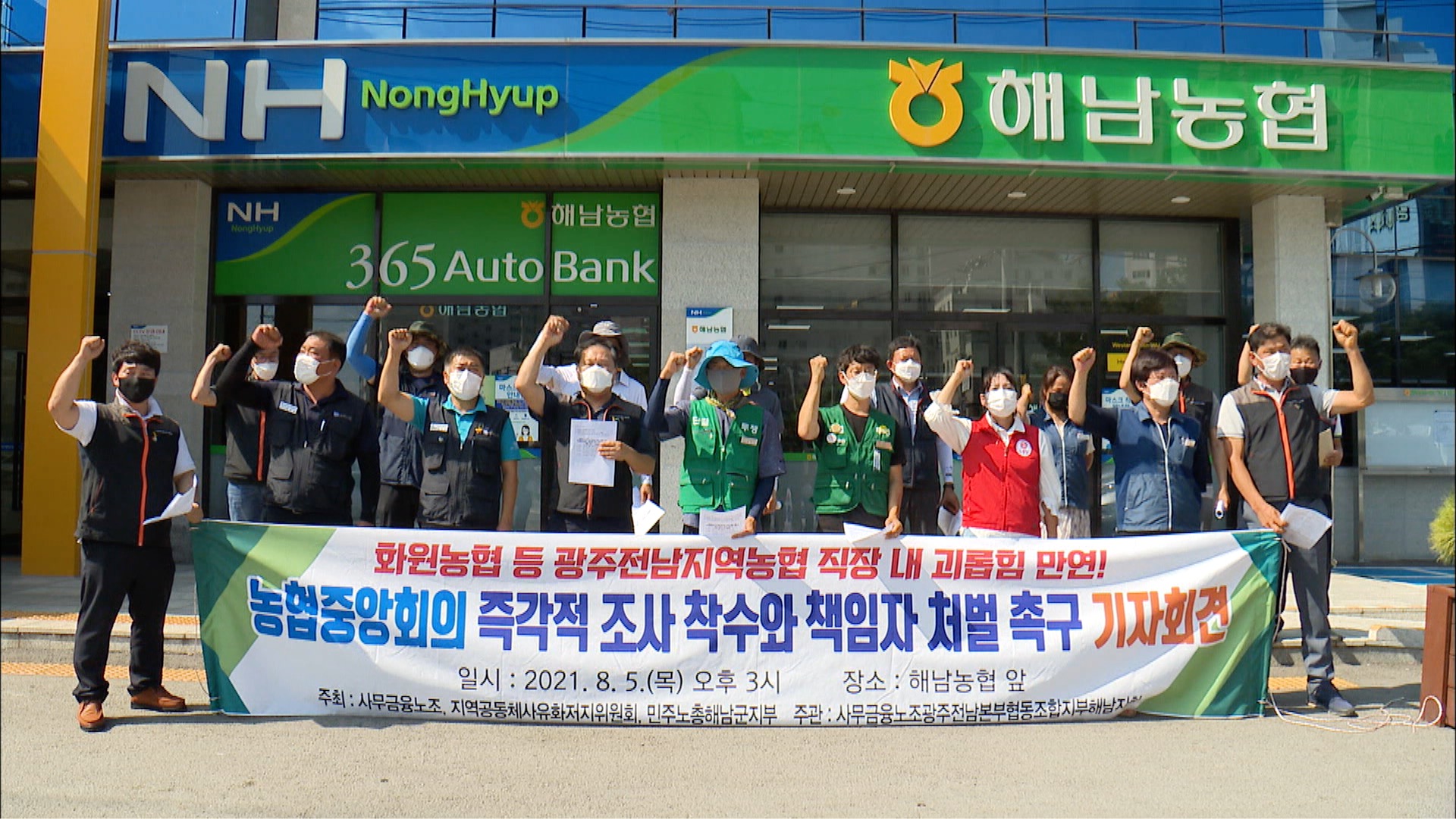 전국사무금융서비스노조는 기자회견을 갖고지난 7월 해남 화원농협 현직 임원이 직원을폭행했다는 의혹에 대해 별다른 진상조사가 이뤄지지 않고 있다며,농협중앙회에 즉각적인 조사 착수와 함께책임자 처벌을 요구했습니다. 이에 대해 전남 농협 측은"가해자로 지목된 임원은'비상임 이사'로 정식 농협직원이 아니"라며'...
