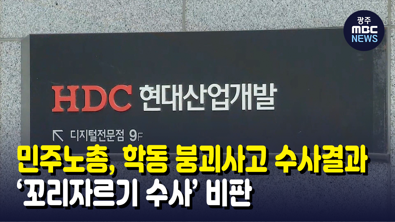 민주노총이 경찰의 학동 붕괴사고중간 수사 결과를 놓고현대산업개발의 책임을 묻지 않기 위한부실 수사라고 비판했습니다.민주노총 광주본부는 오늘(29)광주 동구 학동 붕괴참사 현장에서기자회견을 열고 부실철거를 알고도조치를 취하지 않은 것은현대산업개발에 책임이 있다는 것이라며실무자와 하청업자 구속에 그친경...