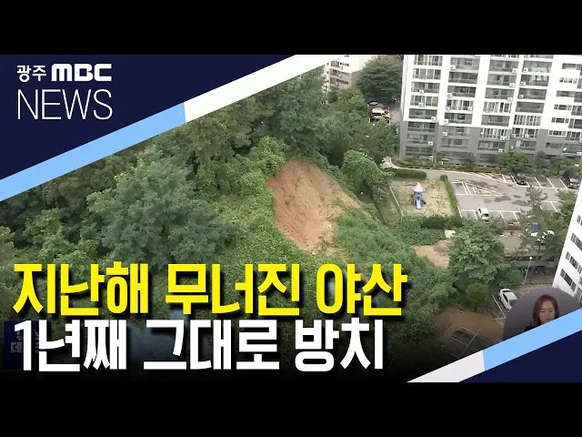 ◀ANC▶ 지난해 산사태가 발생한 한 야산이 1년째 그대로 방치돼있습니다. 해당 토지가 법인 소유라는 이유로 자치단체와 교육청, 사립학교 법인이 서로 책임을 떠넘기다 복구작업이 미뤄진 건데요. 지난해와 같은 사고가 재현되진 않을까 퍼붓는 장맛비 속에 주민들은 불안에 떨어야했습니다. 이다현 기자가 취재했습니다...