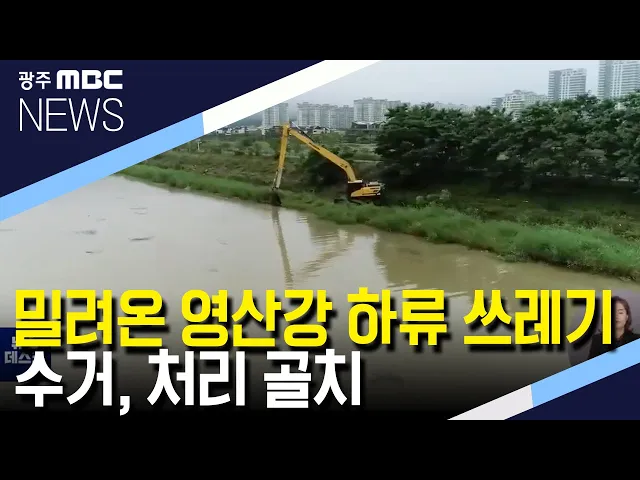 ◀ANC▶ 이번 장맛비로 영산강 하류에는 엄청난 양의 쓰레기들이 밀려들고 있습니다. 수거도, 처리도 어려운데다 강을 따라 조성된 간척지로 연결되는 크고 작은 배수로를 막을 경우 대규모 2차 피해도 우려됩니다. 김안수 기자가 취재했습니다. ◀END▶ 나흘 간의 장맛비가 내린 뒤 영산강 하류입니다. 수초와 생활쓰레...