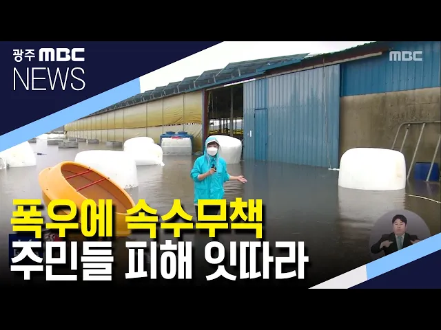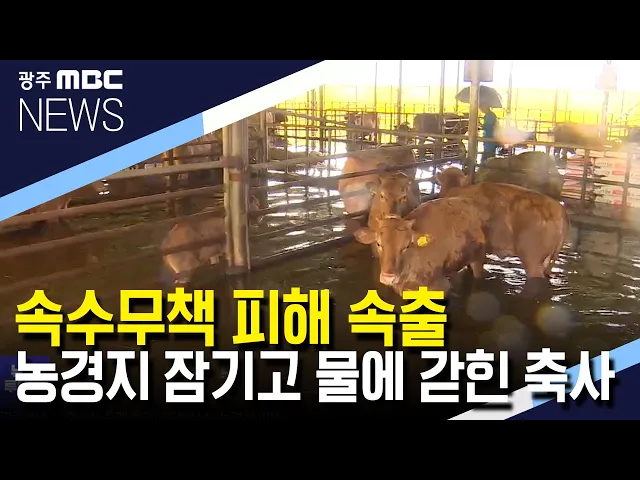 ◀ANC▶ 농경지와 축사 피해도 이어지고 있습니다. 계속되는 비에 아직 복구는 엄두도 내지 못하고 있습니다. 양현승 기자가 취재했습니다. ◀END▶ ◀VCR▶ 해남군에 이어 전남 2번째로 비가 많이 내린 장흥군, 그 중에서도 4백밀리미터 이상으로 장흥 최고 강우량을 기록한 관산읍에 있는 한 한우농장입니다. 폭우에 ...