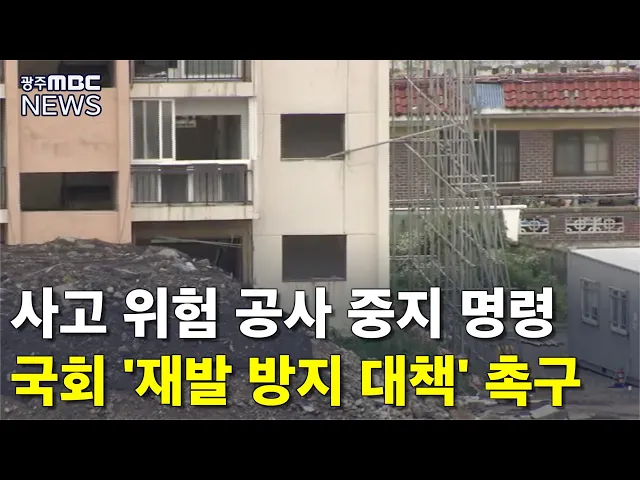 (앵커) 이번 붕괴 참사 이후 특별 안전점검에 나섰던 광주시가 시내 공사현장 7곳에 대해 공사중지 명령을 내렸습니다. 위험요인이 상존하고 있다는 판단에섭니다. 이번 사고와 관련해 현안 보고가 진행된 국회에서는 원청의 책임을 묻고, 재발 방지를 촉구했습니다. 송정근 기자의 보도입니다. (기자) 재건축 공사가 한창...