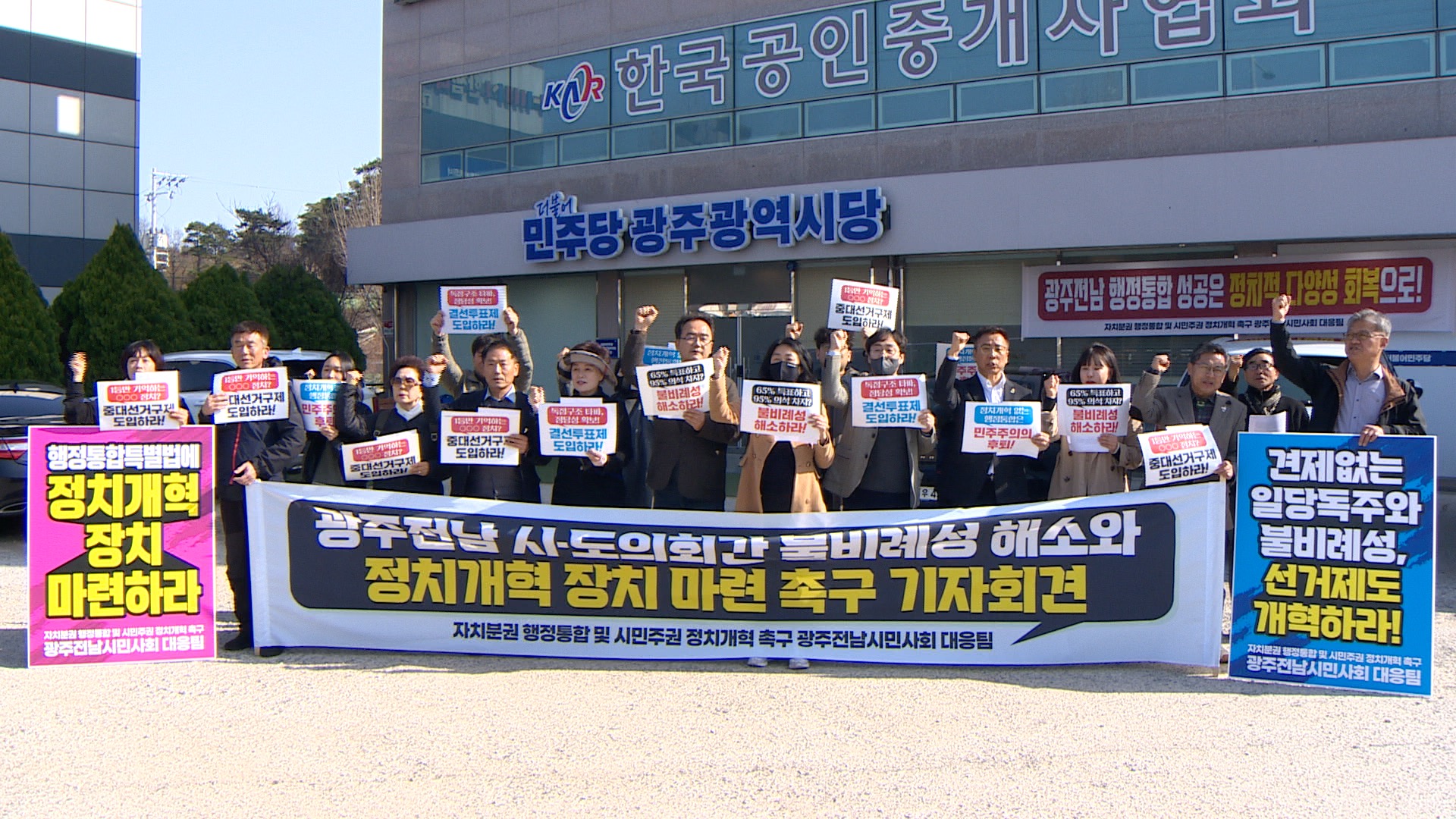 광주·전남 시민사회가 "특정 정당의 의석 독점을 낳는 '불비례성' 문제를 해결하기 위해 선거제도 개혁이 필요하다"고 촉구했습니다.이들은 오늘(4) 더불어민주당 광주시당 앞에서 기자회견을 열고 "광주·전남에서 65%의 지지율로 95%의 대표성을 행사하는 일이 반복되면서 시민들의 참정권이 악화하고 정치 효능감이 낮아...