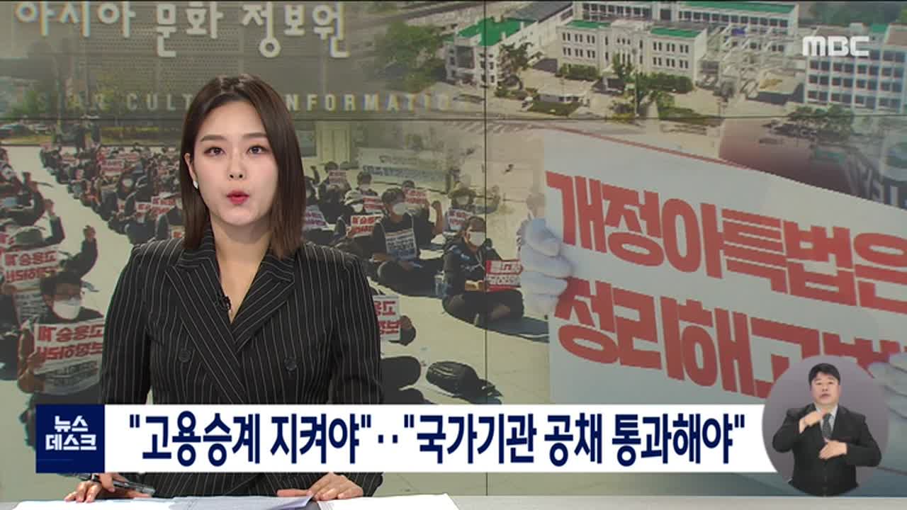 (앵커) 국립아시아문화전당과 아시아문화원을 국가기관으로 일원화하는 특별법 개정안이 통과됐지만, 고용승계 논의는 진전되지 못하고 있습니다. 아시아문화원 노조는 공무원 조직으로 고용을 승계하라고 주장하지만, 정부는 별도의 재단을 만들어 고용을 이어가겠다는 입장입니다. 우종훈 기자가 취재했습니다. (기자) 지...
