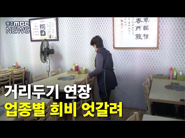 (앵커) 여러분 안녕하십니까 광주mbc 뉴스데스큽니다. 사회적 거리두기 2단계가 이달말까지 연장되면서 자영업자들의 희비가 엇갈리고 있습니다. 지침이 다소 완화된 카페 등 일부 시설은 한숨을 돌렸지만 음식점과 유흥업소들은 속이 타들어가고 있습니다. 보도에 송정근 기자입니다. (기자) 광주 상무지구의 한 카페. 그...
