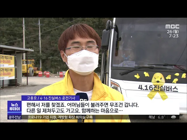 ◀ANC▶ 세월호 진실규명을 위해 동참하는 시민들이 많지만, 오늘은 6년간 세월호 가족들의 발을 자처한 버스기사 한 분을 소개하려고 합니다. 세월호 참사 당시 단원고 학부모들을 태우고 안산에서 팽목항으로 이동했던 고용호 기사 인데요, 요즘은 4.16 진실버스를 운행하며 가족들을 지원하고 있습니다. 김안수 기자가 ...