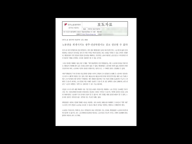민주노총 광주본부와 전남본부는 오늘(22) 공동 성명서를 내고 행정통합 특별법이 노동권을 훼손하고 있다고 지적했습니다.이들은 "특별법 초안에는특정 기업을 위해 유급 휴일을 무급으로 전환할 수 있도록 한 조항이 담겨 있다"며 "투자 유치와 기업 편의를 앞세운 나머지헌법이 보장하는 노동권을 침해하고 있다"고비판...
