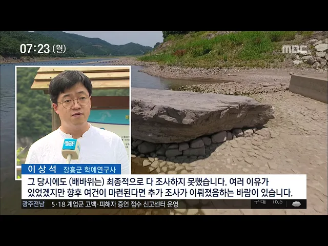 ◀ANC▶ 장흥 탐진강에 14년 전 댐이 건설되면서 국내 최대 고인돌인 '배바위'가 수몰됐습니다. 그런데 최근 몇년째 계속된 가뭄으로 장흥댐 수위가 낮아지면서 14년 만에 다시 모습을 드러냈습니다. 문연철기자가 취재했습니다. ◀END▶ ◀VCR▶ 지난 2004년 장흥댐 건설로 생긴 담수호, 최근 수년째 수위가 크게 낮아...
