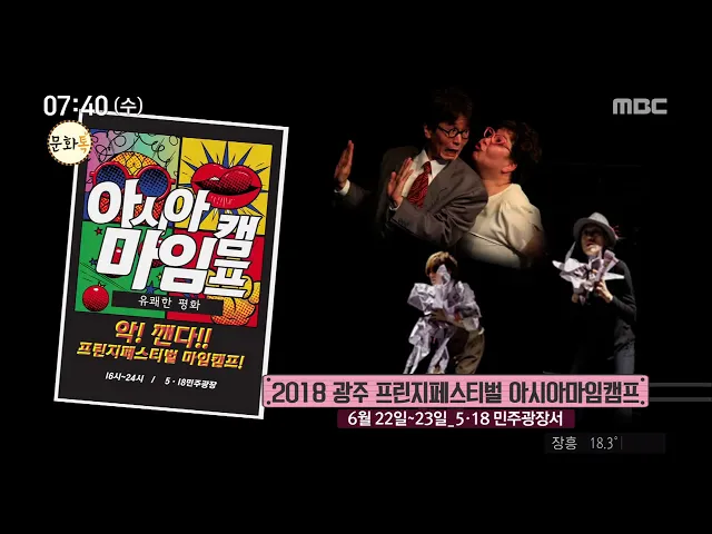 아시아 각국을 대표하는 마임공연팀이 참가하는 아시아 마임캠프의 막이 올랐습니다. 2018 광주프린지페스티벌 행사 가운데 하나로 진행되는 아시아 마임캠프에는 일본과 중국, 태국 등 아시아 5개 나라, 20여 개 마임팀이 참가해 평화의 몸짓으로 소통하는 공연을 펼칩니다. 오늘(23) 자정까지 5.18민주광장에서 진행되는...