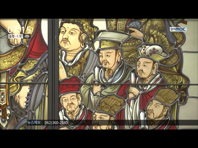 (앵커) ◀ANC▶ 스테인드글라스 하면 보통 성당이나 교회 유리창을 생각하기 쉬운데요. 스테인드글라스와 현대 서양화로 표현된 불화가 광주의 한 사찰을 장식했습니다. 이미지 뉴스리포터입니다. (리포터) ◀VCR▶ 가로 8미터, 세로 2.5미터의 커다란 아크릴화가 무각사 설법전에 걸렸습니다. 캐릭터 같기도 하고 멋스럽...