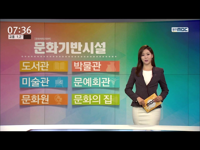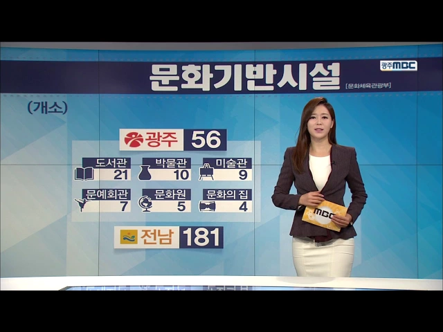 타이틀에 '문화시설' 평소에 도서관이나 박물관 등 문화기반 시설, 얼마나 자주 이용하십니까? 방문하려고 해도, 집 근처에 없어 이용에 불편함을 겪었다면, 이유가 있었습니다. 광주에 있는 문화기반시설은 총 56곳 공공도서관이 21곳이구요, 박물관이 10곳, 미술관이 9곳입니다. 전국 17개 시도 가운데 뒤에서 3번째로, ...