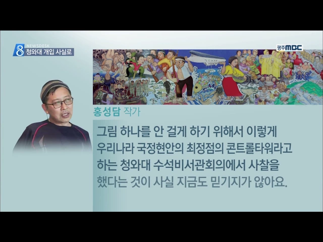 (앵커) 2014년 홍성담 작가의 세월오월 전시 무산과 관련해 얼마전 윤장현 광주시장이 문체부 차관의 압력성 전화를 받았다...이런 고백을 했었죠? 그런데 문체부 차관이 아닌 청와대가 직접 개입했음을 보여주는 문건이 나왔습니다. 김철원 기자가 취재했습니다. (기자) 박근혜 대통령을 허수아비로 표현한 홍성담 작가의 ...